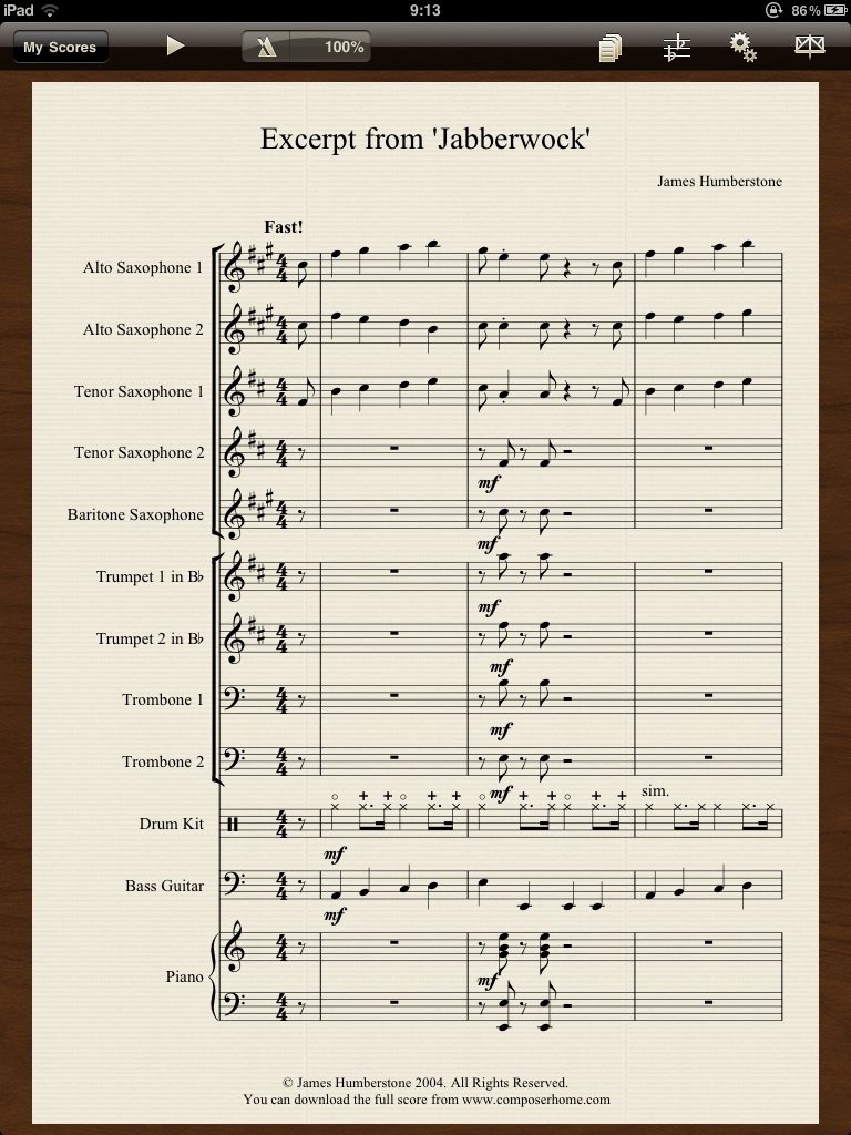As a sample I’ve used an excerpt from my 2004 piece Jabberwock. This was a fairly crazy setting of Lewis Carroll’s poem “Jabberwocky” for combined school concert band and stage band and MLC School premiered it at the Sydney Opera House. You can watch a video of the performance and download the full score (which is also included in Sibelius’ Worksheet Creator, FWIW) here.
