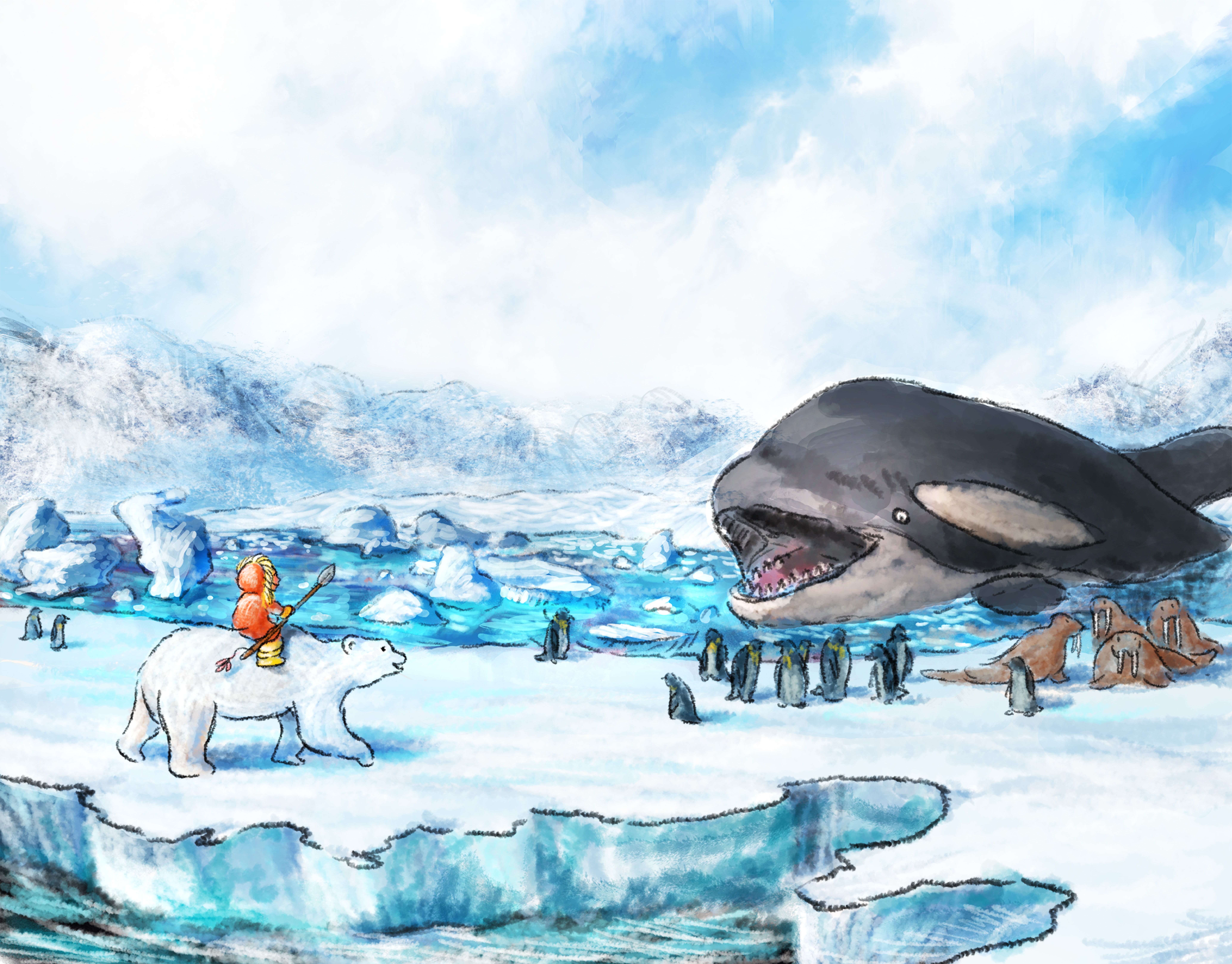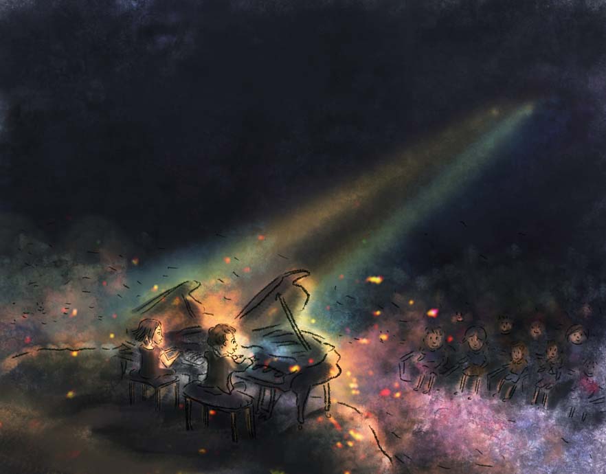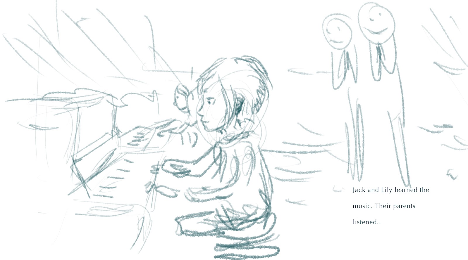 Her first sketches were of Lily and Jack, and she used photos of my youngest children (and ones she found online of Michael Kieran Harvey for “Michael the music teacher”!) to inspire them. She hadn’t been imagining watercolours, but when I mentioned that was why I chose her, she decided to do mixed media, using watercolours for “real life” and digital for daydreams – blurring real life but making dreams become vivid. As the piano begins to speak for the children, these two meet. This is mostly consistent in the book, although it was much slower for Pebble to work in watercolour so a few originally planned to be in the medium ended up being digital.